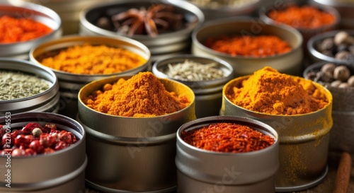 Assorted spices in metal containers, showcasing vibrant colors and textures