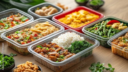 Assorted thai food lunch boxes packed fresh in plastic packaging