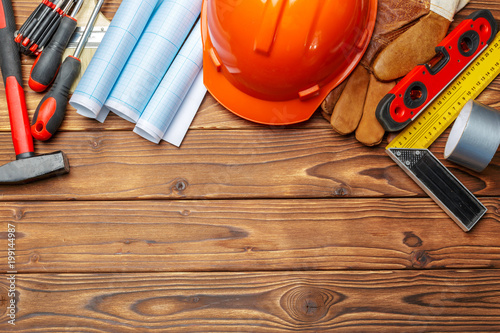 Assorted work tools on wooden table