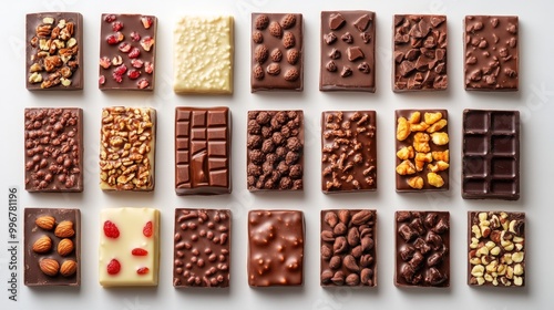 chocolate, bar, candy, sweet, dessert, treat, snack, food, dark, milk, white, nut, almond, pecan, cranberry, fruit, hazelnut, texture, epicure, confectionery, delicious, tasty, appetising, smooth, rich, creamy, variety, selection, assortment, collection, different, multiple, closeup, overhead, background, pattern, design, still life, photo, studio, isolated