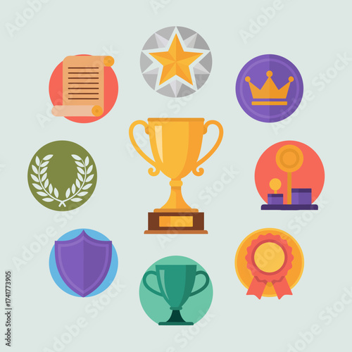 Assortment of Award and Victory Icons in Circles and Central Trophy Keywords: trophy, award, achievement, star, medal, ribbon, laurel wreath, scroll, crown, success, victory, competition, prize