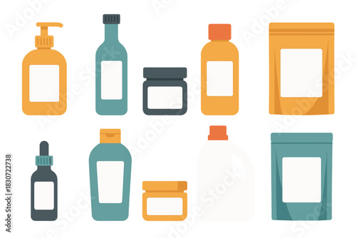 Assortment of blank cosmetic, beauty, and household product packaging containers with empty white labels