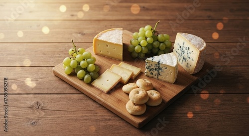 cheese, grape, cracker, board, wood, table, food, platter, snack, epicure, dairy, fruit, delicious, rustic, assortment, variety, selection, fresh, ripe, healthy, natural, organic, meal, party, gathering, event, entertaining, elegant, sophisticated, rich, creamy, savoury, sweet, taste, favor, fine, premium, traditional, classic, celebration, holiday, festive, light, bokeh, background, culinary, kitchen, dining