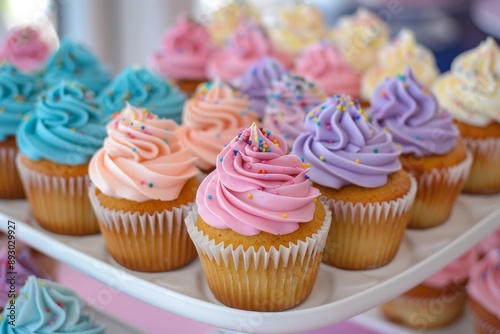 cupcake, colourful, frosting, sprinkle, pink, blue, purple, white, tiered, racked, dessert, bakery, sweet, treat, party, celebration, birthday, delicious, tasty, cute, epicure, pastry, food, sugar, vanilla, chocolate, pastel, whipped, cream, confectionery, sweetness, delight, indulgence, treat