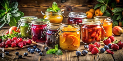 rustic, wooden, surface, preserving, homemade, fruit, jar, glasses, assortment, colourful, fresh, greenery, mint, berry, raspberry, blueberry, peach, apricot, plum, kitchen, farmhouse
