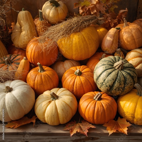 Assortment of Colorful Pumpkins and Gourds with Autumn Leaves