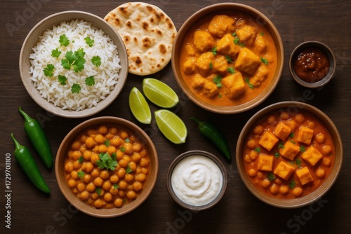 Assortment of Delicious Indian Cuisine Featuring Rice, Chickpeas, Curry, Naan Bread, and Cream on a Dark Surface