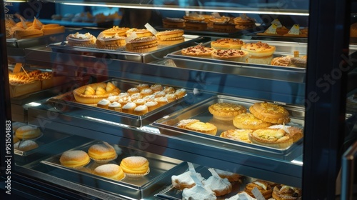 pastry, bakery, showcase, display, delicious, sweet, food, dessert, treat, baked, good, confectionery, sugar, wheat, flour, cream, butter, egg, chocolate, vanilla, cinnamon, nut, fruit, glaze, icing, sprinkle, shelf, glasses, light, illuminated, tray, shop, store, cafes, patisserie, eatery, appetising, fresh, homemade, epicure, artisan