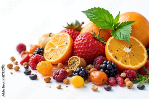 Assortment of dried fruits & herbs, against pure white , vegan, white backdrop, natural ingredients
