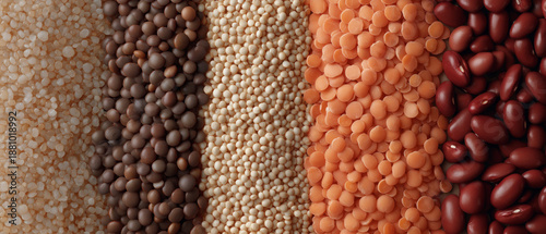 Assortment of dried legumes and grains in vertical stripes, close-up view