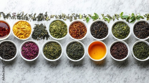 Assortment of Dried Tea Leaves in Bowls on Marble Surface