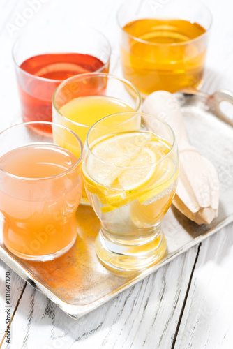 assortment of fresh citrus juices in glasses on white table, closeup vertical