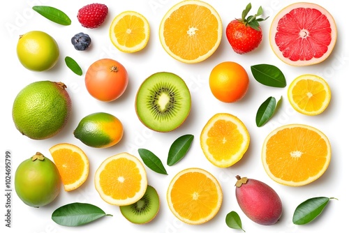 Assortment of Fresh Fruits and Citrus Slices on White Background