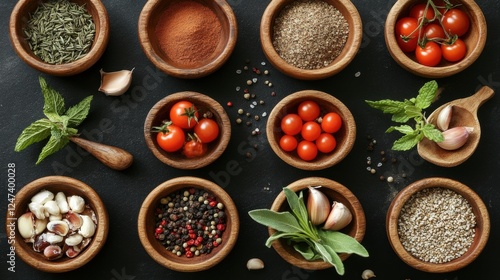 Assortment Of Fresh Herbs And Spices In Rustic Bowls Featuring Cherry Tomatoes And Garlic