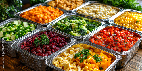Assortment of Fresh Vegetables in Foil Containers: A colorful array of prepared vegetables ready for a meal. Healthy eating.