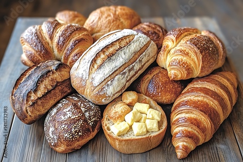 Assortment of Freshly Baked Breads and Croissants on Wooden Table