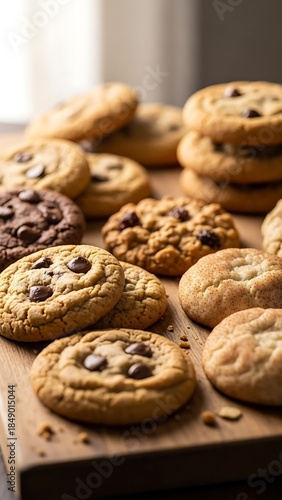 cookie, chocolate, chips, oatmeal, raisin, baked, fresh, homemade, dessert, sweet, treat, snack, food, delicious, tasty, brown, gold, crunchy, soft, chewy, indulgence, bakery, pastry, sugar, flour, butter, egg, vanilla, dough, warm, comfort, kitchen, table, wood, rustic, arrangement, variety, assortment, stack, pile, group, closeup, vertical, sharpened, depth, background, light, inviting, tempting
