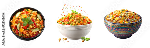 Assortment of fried rice with vegetables in bowls isolated on white.