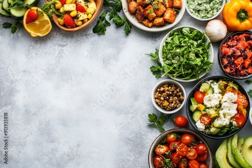 Assortment of healthy food dishes. Top view. Free space for your text , ai