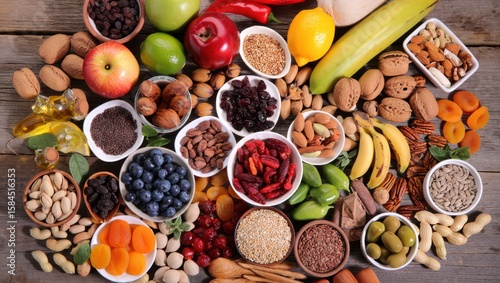 nut, fruit, dried, seed, healthy, eating, food, variety, organic, natural, snack, ingredient, photo, overhead, view, rustic, wooden, background, almond, walnut, pecan, pistachio, peanut, blueberry, grape, cranberry, apricot, banana, apple