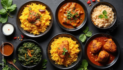 Assortment of Indian recipes featuring chicken curry and rice, spinach dish, and flavorful spiced meat. Served with side of creamy yogurt sauce, this spread offers authentic taste of Indian cuisine.