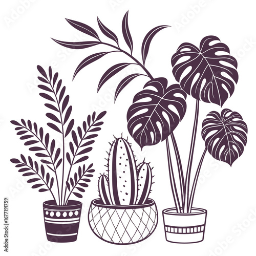Assortment of potted plants in dark purple silhouette on white houseplant monstera