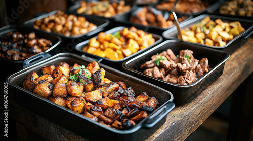 Assortment of roasted potatoes and meats displayed in serving trays on a wooden table, showcasing a variety of cooked dishes perfect for a buffet setting with savory, grilled textures.