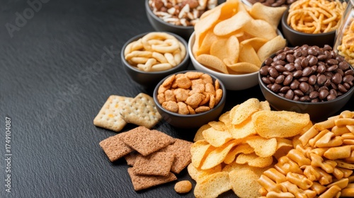 Assortment of Savory Snacks: Overhead View of Bowls Filled with Chips, Pretzels, Crackers, Nuts, and Chocolate on a Dark Surface with Copy Space