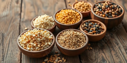 Assortment of seeds and grains in rustic bowls on weathered wood, healthy, harvest