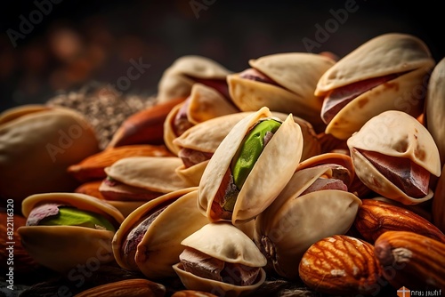 assortment of shelled and unshelled nuts, with a clear focus on pistachios opened to reveal the green nut inside.