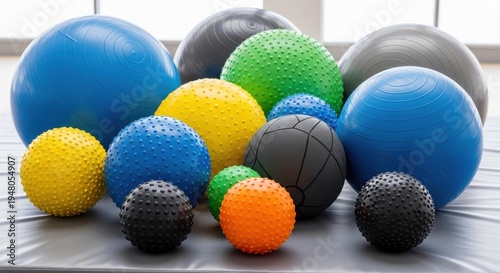 ball, exercise, fitness, therapy, gym, physio, equipment, sport, round, sphere, object, colours, size, collection, group, set, various, different, textured, spiky, smooth, rubber, plastic, blue, yellow, green, orange, grey, black, large, small, medium, arrangement, display, studio, indoor, background, surface, stability, balance, strength, training, physical exercise, rehabilitation, movement, health, wellness, activity