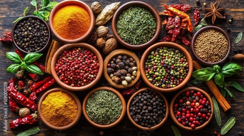 Assortment of various colorful spices including peppercorns, dried chili peppers, turmeric, herbs, and seeds arranged in small bowls on a wooden surface expressing warmth and vibrancy