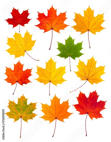 Assortment of vibrantly colored maple leaves, isolated on white background