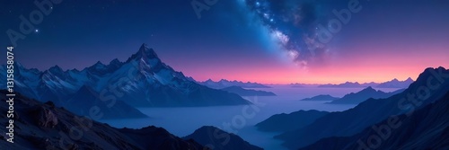 Astral night sky over majestic mountain range, space exploration, outdoors, astral