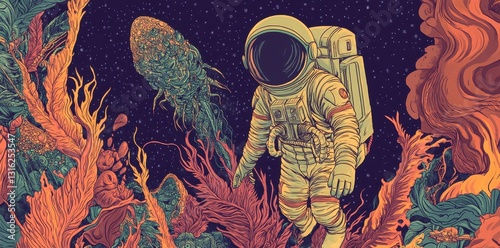 astronaut, space, cosmos, galaxy, star, alien, creature, artwork, illustration, exploration, fantasy, surreal, environment, flora, fauna, underwater, deep, darkness, vibrant, orange, red, green, blue, floating, helmet, suit, oxygen, tank, tentacle, shape, design, abstract, graphic, background, pattern, decorative, texture, movement, energy, light, science, adventure, artistic, creative, composition, perspective, detail, atmosphere