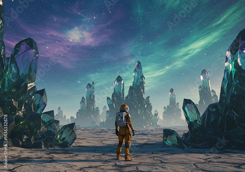 astronaut, space, planet, crystal, exploration, science, sky, galaxy, landscape, fantasy, alien, universe, cosmos, future, travel, adventure, starry, surreal, environment, geology, extraterrestrial, discovery, futuristic, digital, artwork, render, three-dimensional, nature, background, scenic, outer, earth, concept, design, art, illustration, graphic, scene