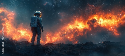 astronaut, nebula, space, exploration, lunar, landscape, starry, sky, future, universe, galaxy, cosmos, technology, science, astronomy, interstellar, red, colonization, gravity, orbit, fantasy, walk, explorer, american, scientist, digital, art, ambient, lighting, dramatic, composition, step, astro, cosmic, system, celestial, forever, view, perspective, evacuated, planet, celestial bodies, humanity, discovery, remote, mission