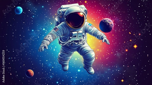 Astronaut floating amidst vibrant cosmic scenery.