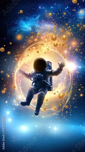 Astronaut Floating in Space Near a Luminous Golden Spiral Galaxy ,A Cosmic Exploration Scene ,Golden spiral galaxy scene ,Golden galaxy astrophotography