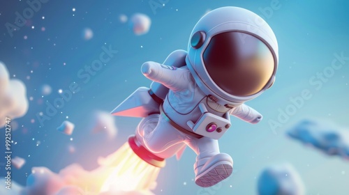 Astronaut flying with rocket illustration 3d rendering on blue background AI generated image