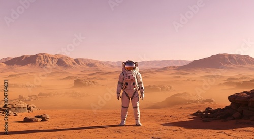 astronaut, mars, space, landscape, planet, exploration, science, futuristic, red, desert, mountain, rock, dust, terrain, journey, adventure, solitude, huge, desolate, alien, rocky, panoramic, high-coloured, colours, light, horizon, scenery, mission, suit, human, geology, technology, future, imagination, discovery, travel, outer, cosmic, universe, astronomy