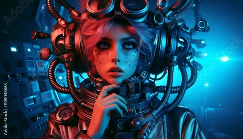 astronaut, spaceship, futuristic, helmet, goggles, control, room, technology, science, fiction, space, exploration, cyborg, artificial, intelligence, digital, art, woman, portrait, neon