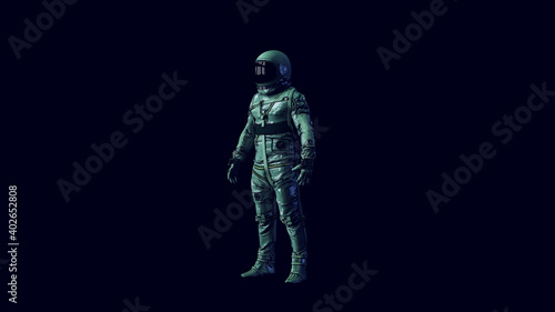 Astronaut with Black Visor and Silver Spacewalk Spacesuit with Blue and Green Moody 80s lighting 3d illustration render