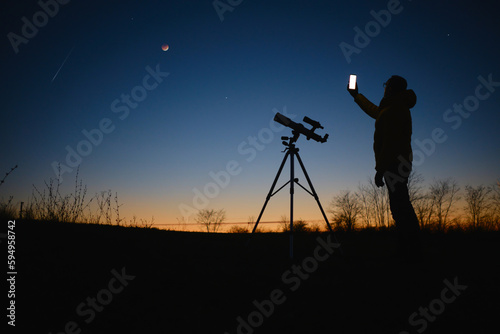 Astronomer looking at the starry skies with planets, falling stars and Moon eclipse with a telescope while using modern smartphone.