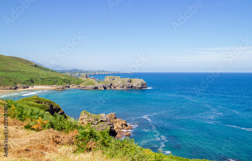 typical, shell, round, beach, white, light, yellow, sand, cliff, infused, wide, many, people, long, clear, water, sea, ocean, best, naturist, asturias, spain, low, tide, left, seaweed, sandy, summer, landscape, green, hill, plant, winding, access, walking, pedestrian, coast, coastal, rocky, path