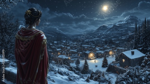 Athena wearing a festive cloak, watching over a peaceful snowy village, with a Christmas star shining brightly in the night sky.