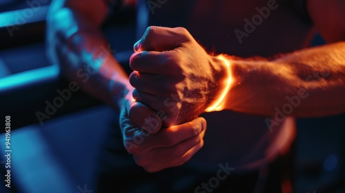 athlete, energy, bracelet, gym, fitness, physical exercise, power, strength, motivation, glowing, neon, sport, training, exercise, determination, sharpened, healthy, lifestyle, active, wellness, body, muscular, hand, closeup, dark, background, light, futuristic, technology, wearable, innovation, performance, enhancement, promoting, supplement