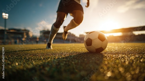 soccer, athlete, ball, field, stadium, sport, outdoors, sunlight, running, green, grass, action, dynamic, competition, team sport, player, game, match, exercise, fitness, training, active, sunny, sky, day, movement, energy, activewear, ground, goal, kick, defense, offence, tournament, championship, audience, passion, speed, agility, victory, sharpened, determination, score