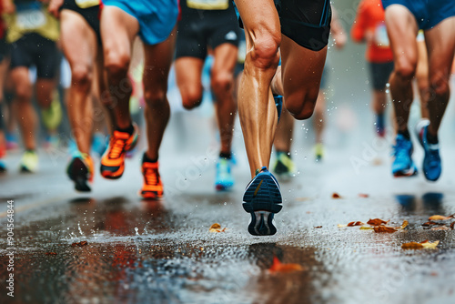 Athletes wearing footwear and active shorts running marathon on asphalt road