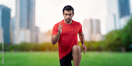 Athletic and sporty man running posture at outdoor green city park exercise session for fit physique and healthy outdoor sport lifestyle. Gaiety green park exercise workout training.